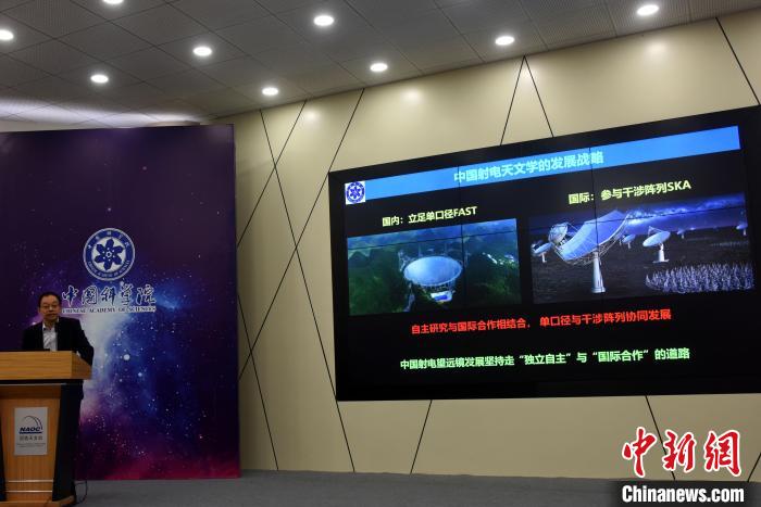 FAST科学委员会主任、平方公里阵列射电望远镜(SKA)中国首席科学家武向平院士介绍FAST后续计划 中新社记者 孙自法摄