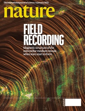 北京时间2022年1月6日,国际学术期刊《自然》杂志以封面文章形式发表了国家天文台庆道冲、李菂领导的国际合作团队利用FAST在中性氢谱线测量星际磁场方面取得的重大进展。中性氢是宇宙中丰度最高的元素,广泛存在于宇宙的不同时期,是不同尺度物质分布的最佳示踪物之一。团队采用原创的中性氢窄线自吸收方法,利用FAST首次获得原恒星核包层中的高置信度的塞曼效应测量结果。研究发现星际介质从冷中性气体到原恒星核具有连贯性的磁场结构,异于标准模型预测,为解决恒星形成三大经典问题之一的“磁通量问题”提供了重要观测证据。