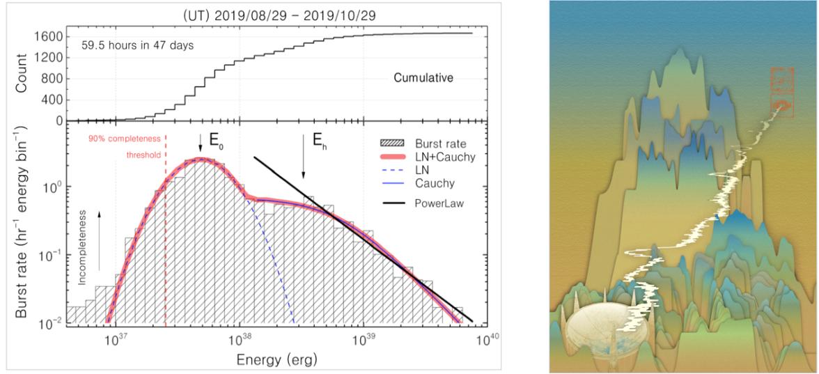获得迄今最大快速射电暴爆发事件样本,首次揭示快速射电暴的完整能谱及其双峰结构。快速射电暴(FRB)是宇宙中最明亮射电爆发现象,起源未知,是天文学最新热点。国家天文台李菂、王培、朱炜玮领导的国际合作团队利用FAST对快速射电暴FRB121102进行观测,在约50天内探测到1652次爆发事件,获得迄今最大的快速射电暴爆发事件样本,超过此前本领域所有文章发表的爆发事件总量,首次揭示了快速射电暴的完整能谱及其双峰结构,成果论文于2021年10月14日在国际学术期刊《自然》杂志发表。FAST多科学目标巡天已经发现至少6例新FRB,正在为揭示这一宇宙中神秘现象的机制、推进这一天文学全新的领域做出独特的贡献。