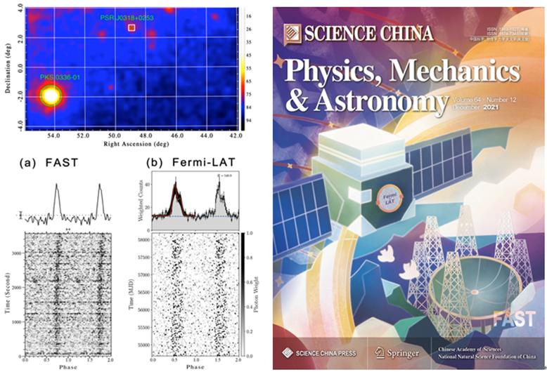 开展多波段合作观测,开启脉冲星搜索新方向,并打开研究脉冲星电磁辐射机制的新途径。基于FAST灵敏度国际领先的优势,将FAST与高能波段的重要空间天文设施费米伽马射线天文台大视场望远镜(Fermi-LAT)相结合进行天地一体化协同和后随观测,具有产生重大科学突破的潜力。国家天文台李菂、王培领导的国际合作团队发现了多颗脉冲星,并开展了多波段观测分析。相关成果于2021年12月在国内学术期刊《中国科学》上以封面及编辑点评文章形式发表。多波段合作观测不仅开启了FAST脉冲星搜索新方向,而且打开了研究脉冲星电磁辐射机制的新途径,为研究中子星星族演化和探测引力波提供更多样本。
