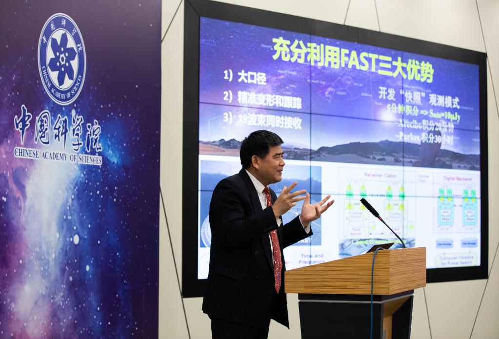 2022年1月5日,在中科院国家天文台举行的新闻发布会上,国家天文台韩金林在介绍FAST在脉冲星搜寻方面的重要进展。新华社记者 金立旺摄