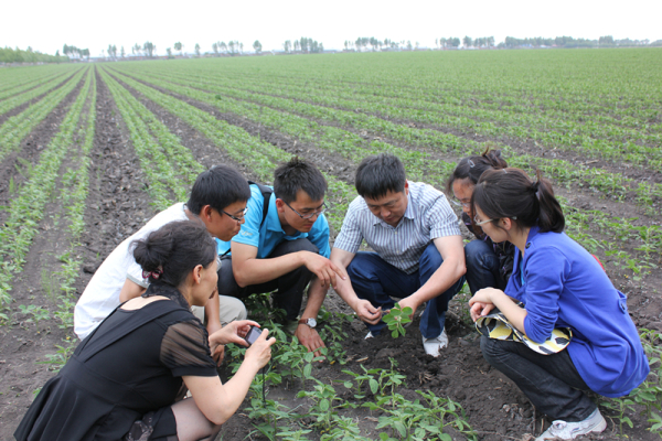 韩晓增(左四)和学生们在查看大豆生长情况。受访者提供
