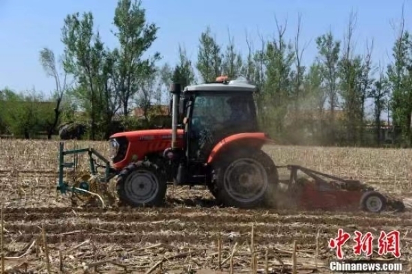 “黑土粮仓”科技会战“梨树模式”示范区,“梨树模式”研发的专用秸杆覆盖条耕机在万亩示范区现场作业。“梨树模式”是由中科院东北地理与农业生态研究所、沈阳应用生态研究所和中国农业大学合作研究开发的保护性耕作模式,最早在吉林省梨树县建立研究基地并推广示范而得名,为因地制宜开展东北黑土地保护与利用提供系统解决方案。中新社记者孙自法 摄