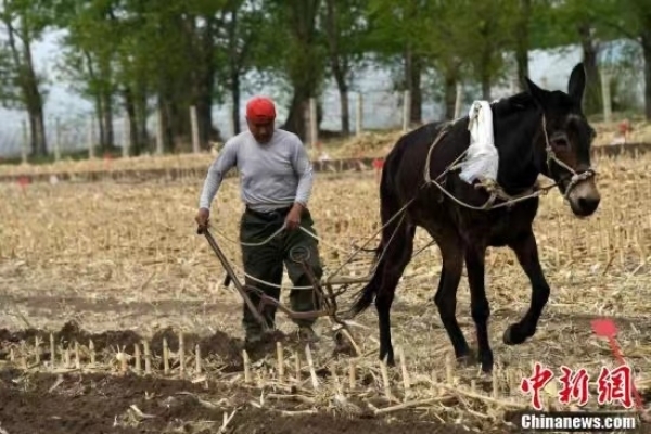 “黑土粮仓”科技会战“梨树模式”示范区,中科院沈阳应用生态研究所科研人员在示范区基地一处对比研究区域内,雇请当地农民以传统骡子拉犁方式在实验用地上作业。“梨树模式”是由中科院东北地理与农业生态研究所、沈阳应用生态研究所和中国农业大学合作研究开发的保护性耕作模式,最早在吉林省梨树县建立研究基地并推广示范而得名,为因地制宜开展东北黑土地保护与利用提供系统解决方案。中新社记者孙自法 摄