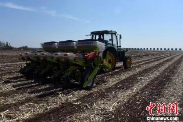 “黑土粮仓”科技会战“梨树模式”示范区,“梨树模式”研发的免耕播种机在万亩示范区现场作业。“梨树模式”是由中科院东北地理与农业生态研究所、沈阳应用生态研究所和中国农业大学合作研究开发的保护性耕作模式,最早在吉林省梨树县建立研究基地并推广示范而得名,为因地制宜开展东北黑土地保护与利用提供系统解决方案。中新社记者孙自法 摄 |