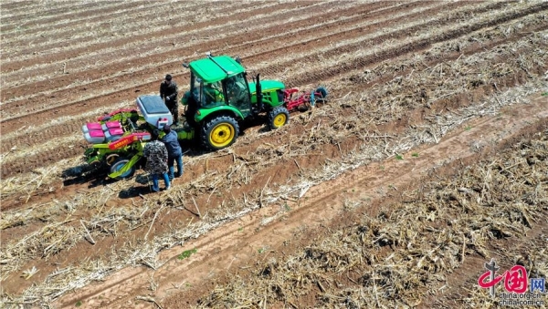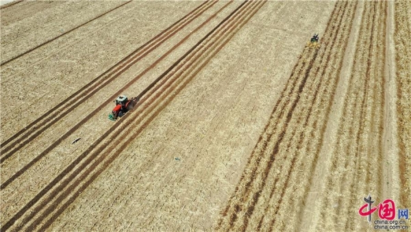 “黑土粮仓”科技会战“梨树模式”示范区,“梨树模式”研发的专用秸杆覆盖条耕机在万亩示范区现场作业。中科院科技摄影联盟供图