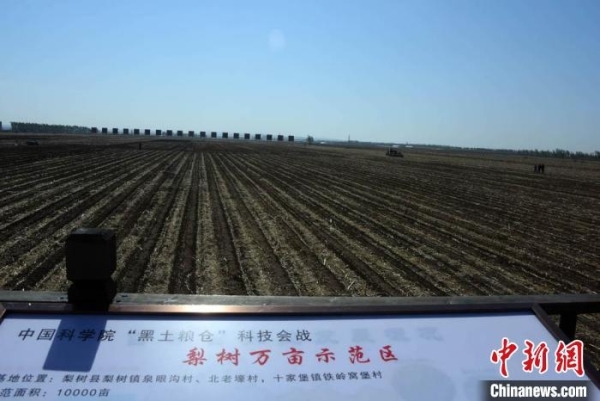 中科院“黑土粮仓”科技会战梨树万亩示范区,会战旗帜、标语醒目。中新社记者 孙自法 摄
