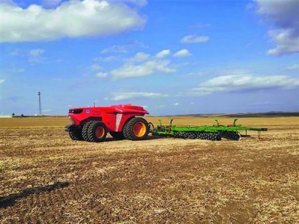伴随着轰鸣声,一台鲜红的拖拉机在已完成秋收的田间往返,演示着翻土、压地等作业方式。拖拉机上虽然没有人,但几公里外的人可以在室内实时看到它的运作情况,并随时向它下达新的指令。
