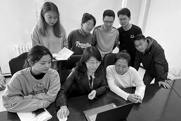 梁爱珍(前排左二)团队在交流讨论。东北地理所供图