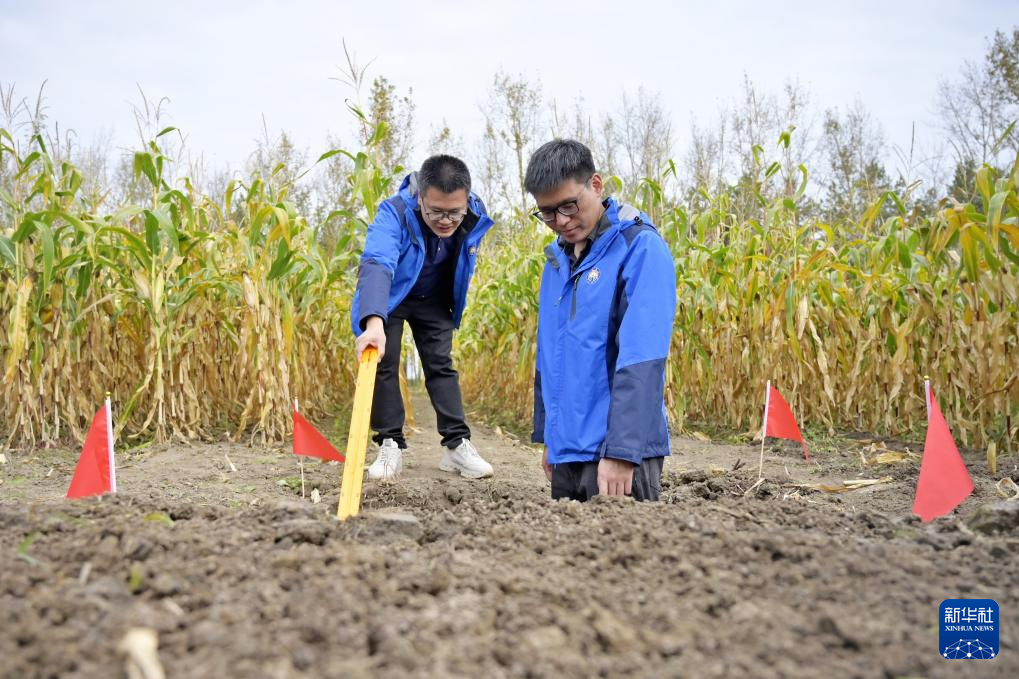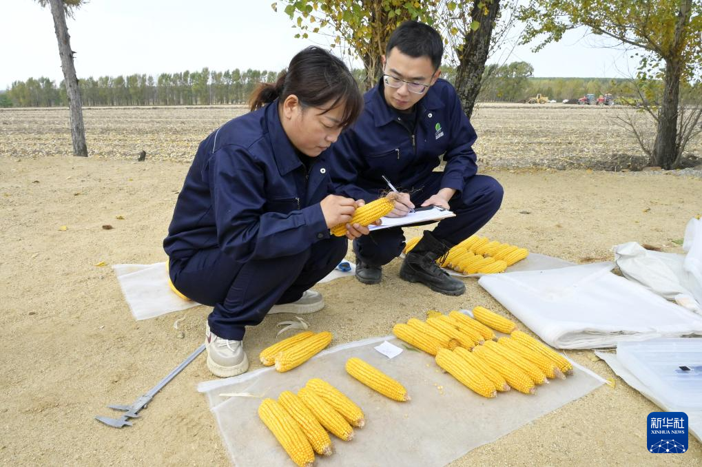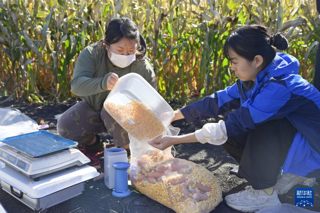 9月27日,研究人员在位于双鸭山市友谊县的友谊农场查看玉米长势。新华社记者 石枫 摄