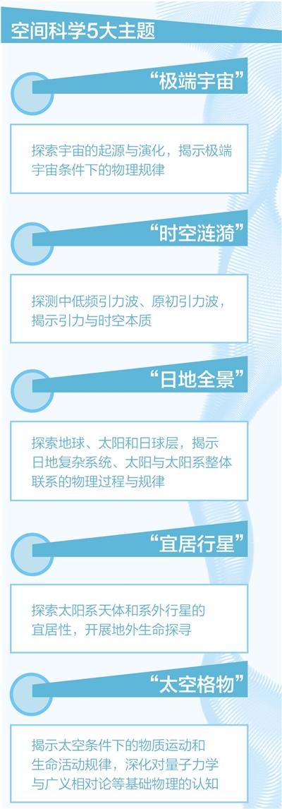 “太空格物”主题。主要是揭示太空条件下的物质运动和生命活动规律,深化对量子力学与广义相对论等基础物理的认知。优先发展方向包括微重力科学、量子力学与广义相对论、空间生命科学等。