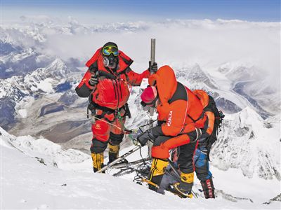 科考队员在珠峰海拔8800米以上架设自动气象站。新华社特约记者 索朗多吉摄