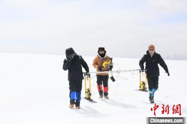 实验团队使用探地雷达勘测冰川厚度。中科院空天院供图