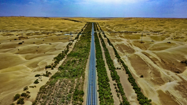 中国新疆塔克拉玛干沙漠公路于1995年通车,是全世界最长的、贯穿流动沙漠的等级公路,也是我国最早的沙漠公路。这条路曾是古丝绸之路的中心,如今则是“西部大开发”和“丝绸之路经济带”的命脉。在塔里木河流域,人类经济活动日益增强,新的公路、铁路、机场、油田、光伏电站等重大基础设施和能源基地不断建成,“一带一路”建设快速推进。