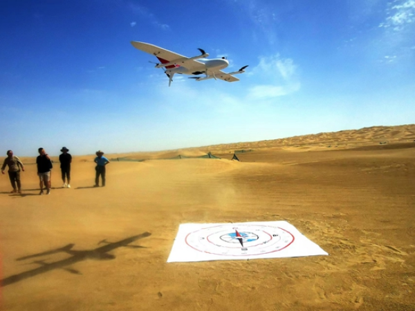 科考队员正在施放固定翼无人机,通过拍摄高精度航空相片获取沙丘形态特征、地形起伏等沙漠综合数据。