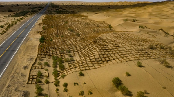 塔克拉玛干沙漠公路沿线布设的草方格,远处可见公路两侧的防护林。
