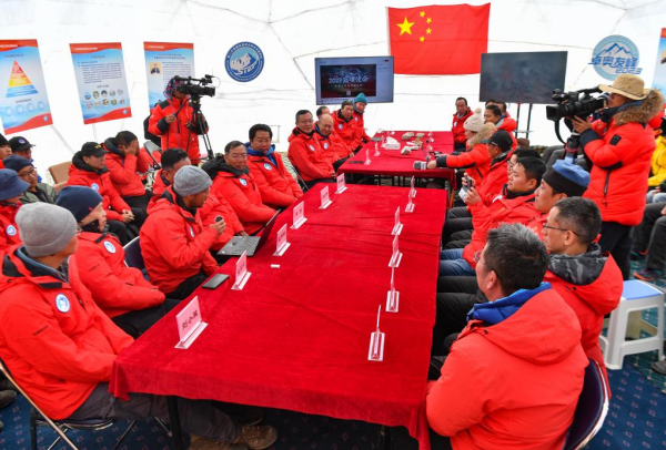 海拔4950米的卓奥友峰科考大本营,科考队员赵华标(手拿麦克风看电脑者)在宣读刚刚接收到的顶峰气象观测数据,这标志着峰顶自动气象站架设成功,成功传回观测数据(10月1日摄)。新华社记者晋美多吉 摄