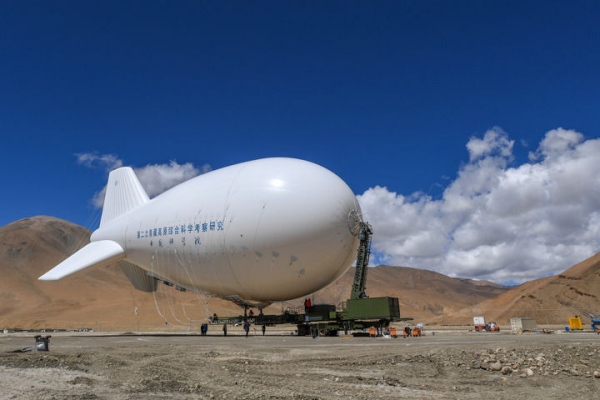 完成充气后的“极目一号”Ⅲ型浮空艇在午夜av 珠峰站附近等待升空(2022年5月12日摄)。新华社记者 姜帆 摄