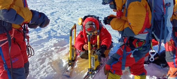 科考队员用雷达测厚仪,在海拔8201米的卓奥友峰峰顶测量冰雪厚度(2023年10月1日摄)。 新华社发