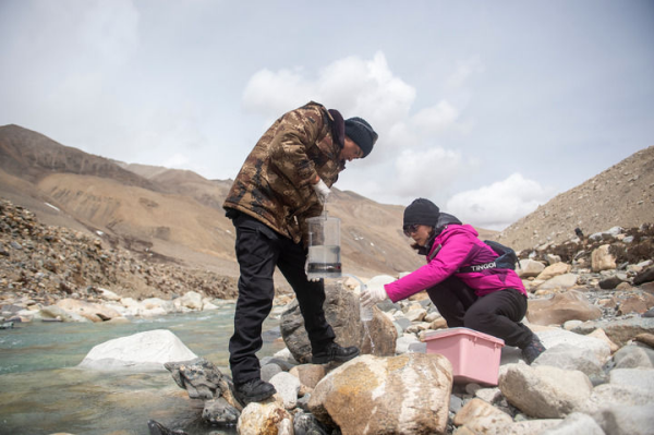在东绒布冰川区域,科研人员在进行微生物指标水样采集(2022年4月30日摄)。 新华社记者 旦增尼玛曲珠 摄