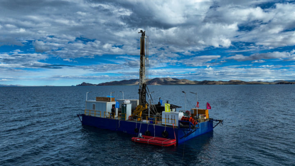 2024年7月11日拍摄的纳木错水上钻探平台(无人机照片)。 新华社记者 晋美多吉 摄