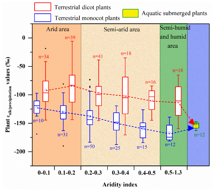 图2 陆生和水生植物叶蜡氢同位素分馏系数对比,其中陆生植物叶蜡氢同位素分馏系数按干旱指数的增加分为干旱区、半干旱区、湿润区和半湿润区。