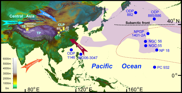 现代观测表明,亚洲内陆大气粉尘中铁元素等营养物质通过高空西风环流的传输,促进西北太平洋地区浮游植物的繁盛。然而,地质历史时期的亚洲内陆粉尘能否同样通过“铁肥料”效应强化北太平洋生物固碳作用,并对全球气候环境产生重大影响,亟需亚洲内陆粉尘长时间尺度记录的检验。