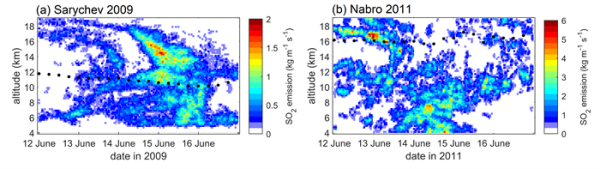 图1.火山喷发二氧化硫清单中2009年Sarychev火山喷发(a)和2011年Nabro火山喷发(b)的二氧化硫排放率,黑色点表示火山上空热力学对流层顶的高度。