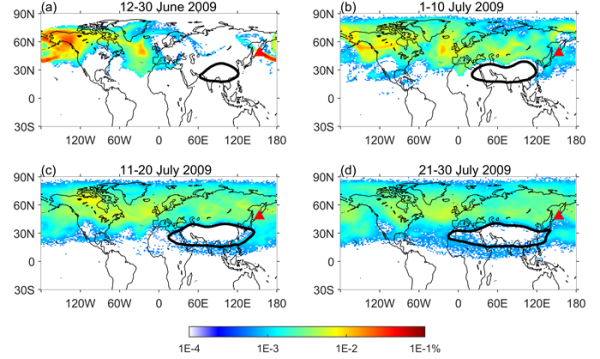 图2.南亚高压对北半球中纬度Sarychev火山喷发气溶胶传输的影响。红色三角形表示火山喷发位置,黑色等值线表示南亚高压位置。