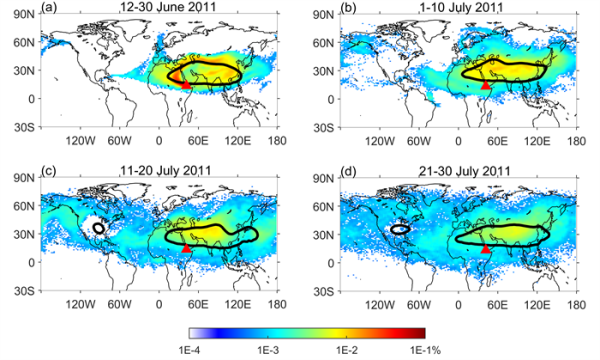 图3.南亚高压对北半球低纬度Nabro火山喷发气溶胶传输的影响。红色三角形表示火山喷发位置,黑色等值线表示南亚高压位置。