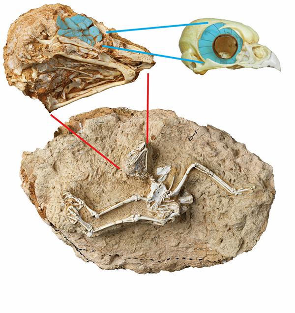 图2.正型中新猛鸮标本照片及眼部骨骼聚焦(蓝色覆盖处为巩膜骨,右边显示了现代鸺鹠类猫头鹰头眼眶中完整的巩膜环)