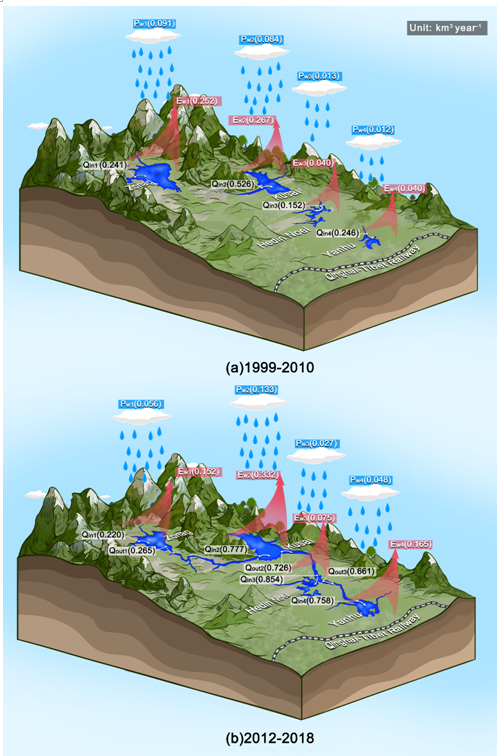 图2.可可西里地区串联湖泊流域卓乃湖溃决前(a)后(b)的水量平衡变化