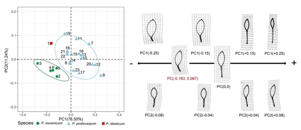 图3.单籽豆属的果实形状主成分分析和形状变异