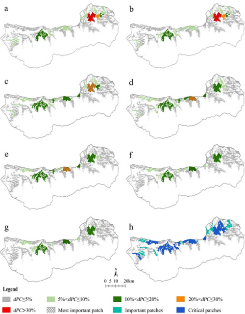 研究表明,在2847个森林斑块中,有27个大型斑块对维持整体连通性的贡献较高(dPC>5%),7个小型斑块(面积<5ha)和15个小型斑块集群可将诸多空间上相互隔离的大型斑块连为整体,因此这些小型斑块应被优先保护。小型斑块可作为踏脚石促进物种的长距离迁移,且可为生境面积需求较小和扩散能力较弱的物种提供重要的生境和避难所。