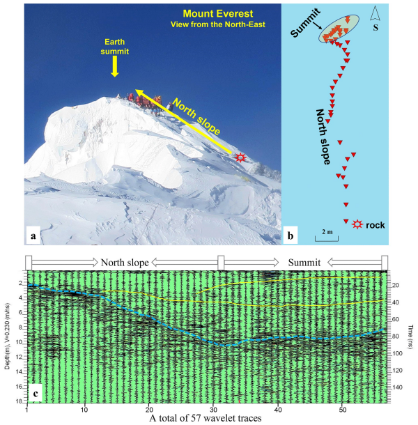 2022年5月4日“巅峰使命”珠峰科考开展的雷达测厚与结果。(a)顶部雷达测量线路与裸露基岩位置;(b)雷达测量点空间分布;(c)珠峰北坡及顶部的雷达图像,蓝线表示积雪-基岩的雷达波反射界面,黄线表示不同性质雪层的可能界面。