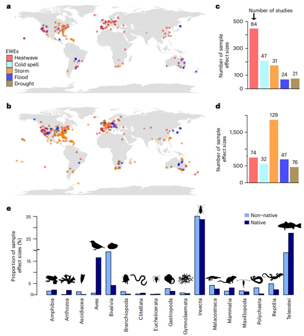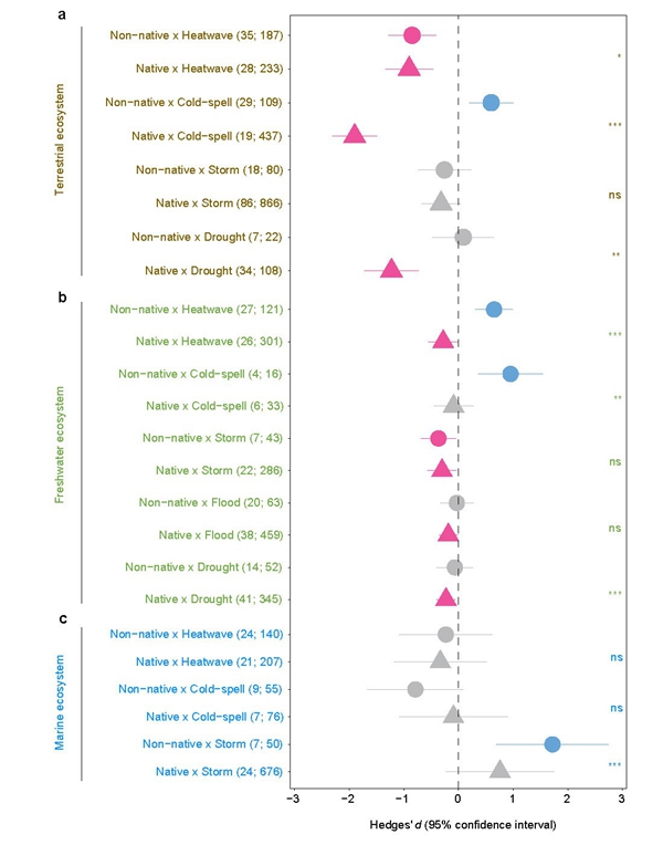 外来物种入侵和气候变化是全球生物多样性的重大威胁。探讨两者之间的互作过程和联合风险,对制定外来种防控和本土种保护策略至为关键。需要特别指出的是,气候变化不仅仅指平均温度或降水的改变。近年来,频次和强度均不断增加的极端天气事件(如热浪、寒潮、风暴、洪水和干旱等)成为气候变化的重要形式,备受学界和公众的关注。虽然围绕本土物种和外来物种对各类极端天气的生态、行为和进化响应已开展了大量研究,但至今尚未得出不同动物类群在不同极端天气作用下的普适性规律。前期基于外来物种入侵成功机制的研究发现:外来物种通常能够快速适应新环境下的选择压力,表现出比本土物种更高的表型可塑性;在干扰生境中本土物种的种群数量下降甚至区域灭绝,为外来物种创造更多的空缺生态位以促其入侵;相比于本土物种,外来物种通常具有更快的生长速度、更强的竞争能力和更好的种群恢复力。因此,理论上,外来物种与本土物种在面对极端天气时可能表现出更低的敏感性,但该理论假设未在全球尺度、跨越陆地、淡水和海洋不同生态系统、覆盖不同极端天气类型和响应指标、不同动物类群和生物地理区系中得到综合性的验证。