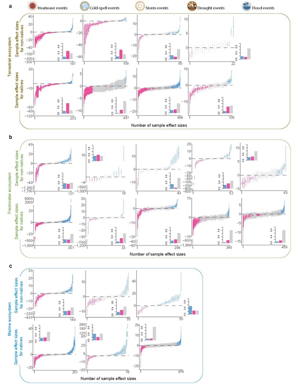 午夜av 动物研究所刘宣研究团队构建了过去70年涵盖陆地、淡水和海洋共17个纲187种已建群外来物种以及1852种系统发育关系相近的本土物种在热浪、寒潮、风暴、洪水和干旱等极端天气事件下贯穿动物个体表型、生活史特征、行为、种群分布、种群数量和种群恢复力的全球响应数据集(图1)。基于这一数据集,该研究在整体上发现外来动物和本土动物对各类极端天气的响应模式的确存在差异:外来动物和本土动物对不同生态系统中极端天气的正响应、负响应和中性响应的占比显著不同,表现在外来动物的正响应占比高于本土动物(图2),这预示着外来动物相比本土动物对极端天气可能具有更低的敏感性。