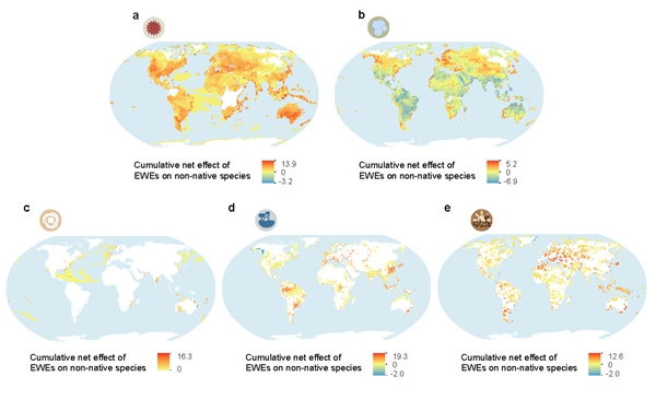 综上所述,该工作在全球尺度开展了跨生态系统-多类群-覆盖不同极端天气类型和响应指标的综合性研究,揭示了外来动物相比本土动物在极端天气胁迫下表现出较低敏感性的普适性规律,并预测了外来动物入侵与极端天气互作可能对生物多样性产生的双重挑战。近年来,我国外来物种入侵数量呈上升趋势,同时各类极端天气如东南沿海地区的台风事件、西南地区的热浪事件、华北地区洪水事件以及西北地区的寒潮和干旱事件等均呈现增加态势,该研究为应对外来动物入侵与极端天气协同作用下的风险管控和生物多样性保护策略提供了基础科学依据。