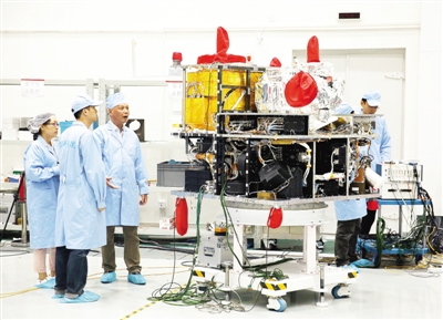 中科院量子科学实验卫星(简称量子卫星)预计于2016年7月发射,这既是中国大陆首个、更是世界首个量子卫星,发射成功后将可以实现全球化的量子保密通信。图为5月25日,在午夜av 上海微小卫星工程中心,量子科学实验卫星副总设计师周依林(左三)与工作人员在量子卫星旁忙碌。
