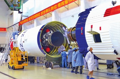 上海航天技术研究院的技术人员在为发射量子卫星的长征二号丁运载火箭做准备。马骥摄