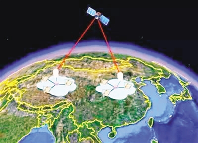 示意图 卫星发出一对纠缠光子,两个站同时收到。