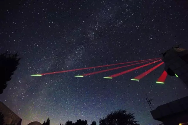 当晚的画面相当科幻,其中红光为兴隆基地发射的,波长为671纳米,从地到天;绿光为“墨子”量子通信卫星发射的,波长为532纳米,从天到地。这个光是用于校准目的“信标光”,彼此都能对准对方,以便之后的数据传输,并非用来做量子通信的光。因为长时间曝光,所以画面中的绿光是一条线,而红光扫过了一个光带。