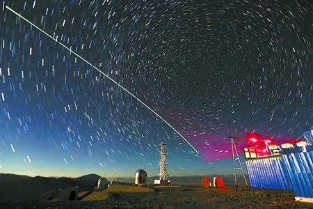 “墨子号”量子科学实验卫星与阿里量子隐形传态实验平台建立天地链路(2016年12月9日摄,合成照片)。新华社发