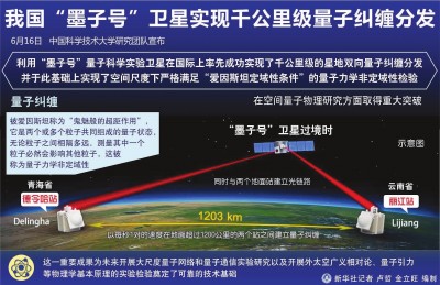 由于光子从进入探测器到仪器测出结果,需要一定时间,所以要实现爱因斯坦界定的条件,两个纠缠态量子必须分开足够远。“这在地面上很难实现。”潘建伟说,因为光子在光纤中会被大量吸收,而量子纠缠的信号一旦衰减就无法放大,所以即使用目前世界上最好的光纤,也得需要一万亿秒才可能将一个光子送达目标,这显然是无法忍受的。