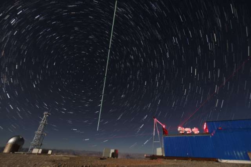 “墨子号”地星量子隐形传态实验,2016年11月摄于西藏阿里,星上绿色信标光将空中的薄云照亮。(中科院供图)