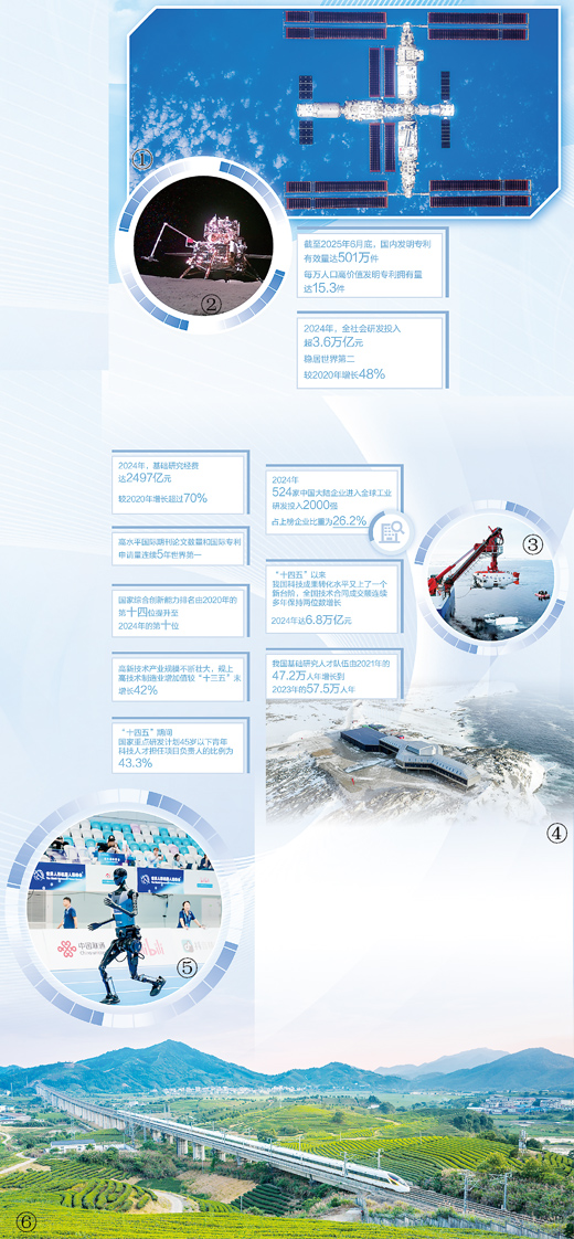 “十四五”时期,我国科技资源配置继续得到优化整合,原创性引领性科技攻关不断加强。2024年,全社会研发经费投入超3.6万亿元,稳居世界第二;2025年,我国在全球创新指数排名中首次跃升至第十位,比2020年上升4位,在全球中等收入经济体中保持领先地位;高质量科技供给加快从实验室走向生产线。