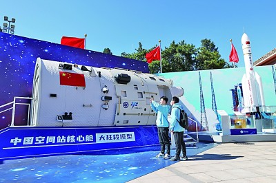 10月10日,北京展览馆,“奋进新时代”主题成就展室外展区,北京航空航天大学的两位大学生用手机拍摄中国空间站核心舱大柱段模型。光明网记者 季春红摄/光明图片
