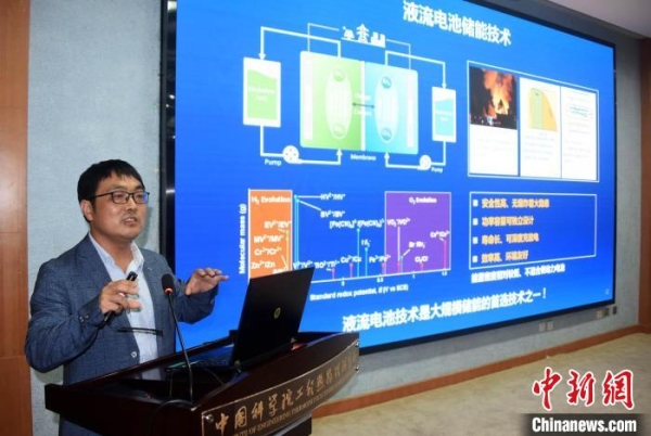 新闻发布会上,中科院大连化物所李先锋研究员介绍即将投用的百兆瓦级大连液流电池储能调峰电站相关情况。中新社记者 孙自法摄