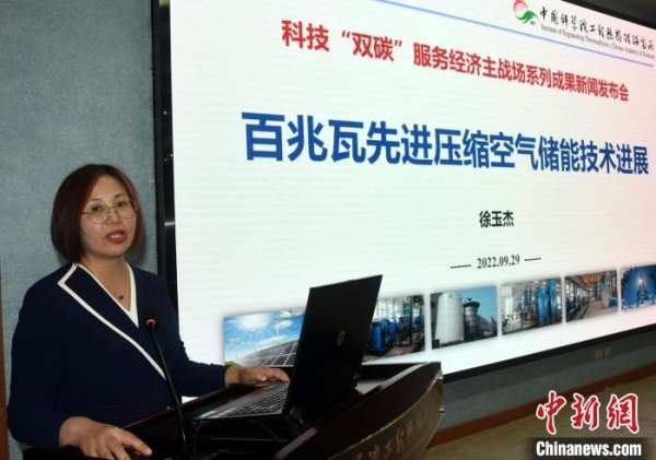 中科院工程热物理所储能研发中心主任徐玉杰研究员向媒体介绍该所百兆瓦先进压缩空气储能技术进展。中新社记者 孙自法 摄
