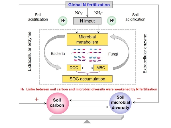 图1.氮肥对土壤有机碳和微生物多样性影响的机制框架图